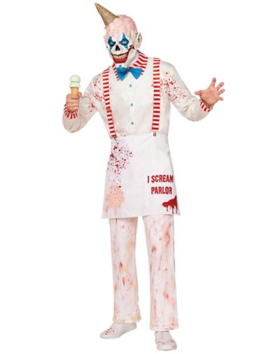 Think your neighbors have a craving for something sweet? Give them the ultimate scare when you wear this I-Scream Man Clown Costume. Complete with a sinister clown mask, a blood-splattered button-down shirt, and an apron, this horrifying clown set has everything you need to serve up some screams this Halloween! Includes: Full mask Shirt Apron Crewneck Long sleeves Button closure Material: Polyester, spandex, latex Care: Spot clean Imported Note: Shoes and prop sold separately WARNING: Do not use if allergic to latex.
