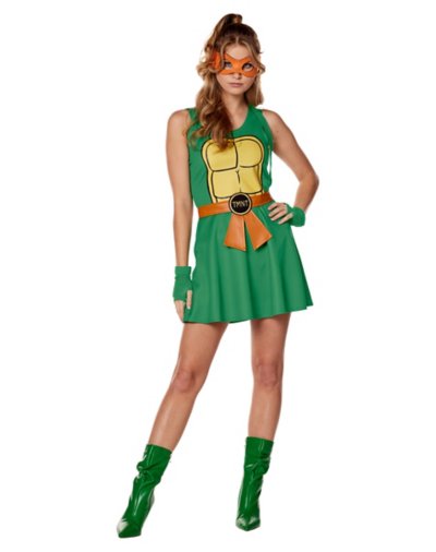 Dress up as your favorite pizza-loving superhero in this officially licensed Teenage Mutant Ninja Turtles Dress Costume! This set includes a sleeveless dress, a shell backpack, gloves, a belt, and 4 eye masks so you can choose whether you want to be Michelangelo, Donatello, Raphael, or Leonardo. For the perfect group Halloween costume, grab a few friends and dress up as all four Teenage Mutant Ninja Turtles! Officially licensed Includes: Dress Shell backpack 4 eye masks (red, blue, purple, and orange) Gloves Belt Sleeveless Pullover style Material: Polyester, spandex, nylon, polyurethane Care: Spot clean Imported Note: Shoes sold separately.