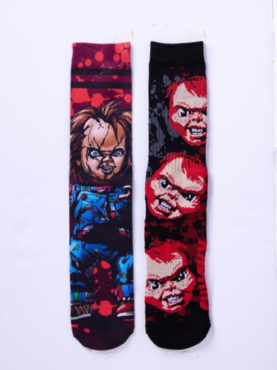 Hoping to add some killer style to your wardrobe? Prove that you're the ultimate horror fan when you get this two-pair of officially licensed Chucky crew socks. Each pair features a gory design that fans will adore! Officially licensed Includes: 2 Pairs of socks Material: Polyester, spandex Care: Machine wash Imported.