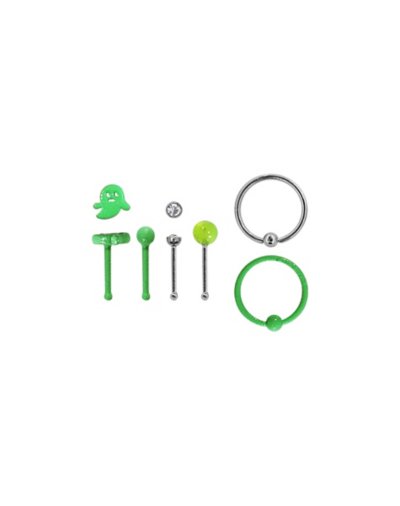 Hold under direct or incandescent light for 1-5 minutes to activate glow Exclusively at Spencer's Includes: 4 Bone nose rings 2 Captive hoop nose rings Piercing Type: Nose Material: 316L surgical steel Enamel plating Gauge: Gauge/0.8mm Length: 6mm Ball Size: 2mm Stone Type: Cubic zirconia Jewelry Care: Clean with antibacterial soap and warm water Piercing Care: Clean withH2Ocean Aftercare Spray(sold separately) or saline solution Imported Note: Do not use any harsh, alcohol-based chemicals as this may cause tarnishing Wear in healed piercings only. If ir.