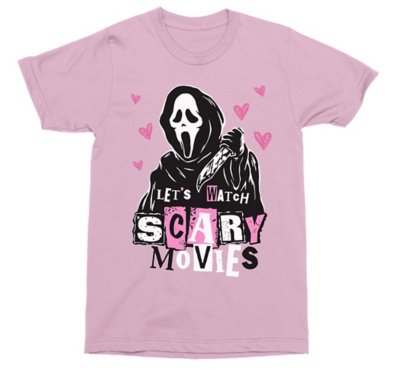 In the mood for horror? Celebrate your fave horror icon with this pretty-pink, officially licensedLet's Watch Scary Movies T Shirt from Ghost Face! Officially licensed Crewneck Short sleeves Material: Cotton Care: Machine wash; tumble dry low Imported This shirt is Unisex Sizing only For a fitted look, order one size smaller than your normal size Ghost Face is a registered trademark of Fun World Div., Easter Unlimited Inc. Ghost Face protected under worldwide copyright registration and is the exclusive property of Fun World Div., Easter Unlimited Inc. All Rights Reserved.