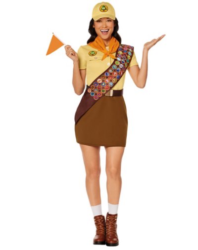 Show off your adventurous spirit with this officially licensed adult Russell the Wilderness Explorer costume! This costume's adorable patch decals and cheerful yellow belted dress and hat are sure to have you repping your favorite Pixar character in style at your next Halloween outing. Officially licensed Includes: Dress Neckerchief Sash Hat Short sleeves Material: Cotton, polyester, spandex Care: Spot clean only Imported Note: Shoes and flag sold separately.