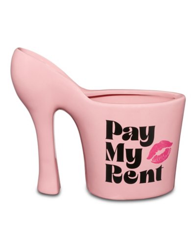 Let everybody know it's time to pay up with this officially licensed Pay My Rent Heel Molded Coffee Mug! Made with sleek, pink ceramic, retro-inspired lettering, and kiss decals, this mug is perfect for any diva looking to start their morning right. Dimensions: 6" H x 3.5" W x 7" D Capacity: oz. Material: Ceramic Care: Hand wash Imported.
