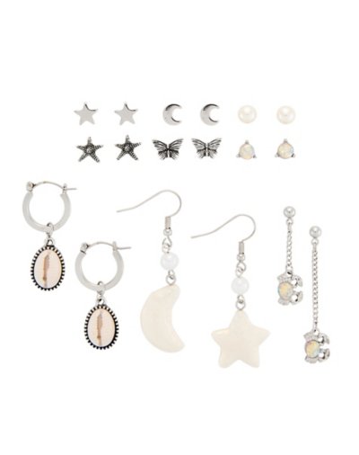 Includes: 6 Pairs of stud earrings 3 Pairs of dangle earrings Material: Zinc, steel, plastic Stud, hoop, and fish hook closure Jewelry Care: Wipe clean or useSpencer's Jewelry Wipes Imported Note: Do not use any harsh, alcohol-based chemicals as this may cause tarnishing This is a decorative item and should not be worn to sleep.