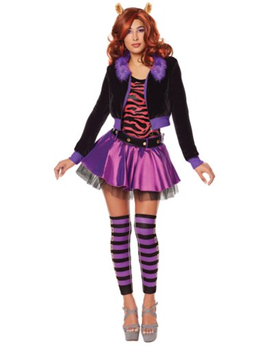 Who knew werewolves were so fashionable? Bring your favorite Monster High character to life with this officially licensed Clawdeen Wolf costume! Featuring a jacket, tank top, skirt, legwarmers, and clip-on ears, this costume will have you howling at the moon all night long. Officially licensed Includes: Jacket Tank top Skirt Leg warmers Clip-on ears Crewneck Long sleeves Pullover style Material: Polyester, spandex Care: Spot clean Imported Note: Shoes and jewelry not included.
