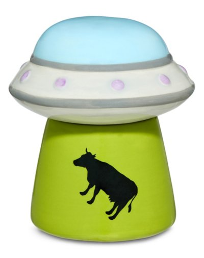 Keep your goodies safe and stashed away from aliens with this Alien Cow Abduction Jar. This cool jar features an airtight lid for freshness and is sure to make a great decor piece in your home. Dimensions: 4" H x 3.5" W x 3.5" D Material: Ceramic Care: Spot clean Imported.