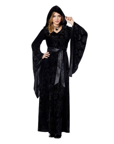 Complete your Halloween look with this velvet hooded robe. The textured velvet material will give you a detail that will have you standing out. Use this robe as the perfect base for any costume this year! Includes: Hooded robe Belt V-neck Long angel sleeves Pullover style, tie closure Length: About 57.5" from shoulder to hem Material: Polyester Care: Spot clean Imported Note: Necklace and shoes sold separately.
