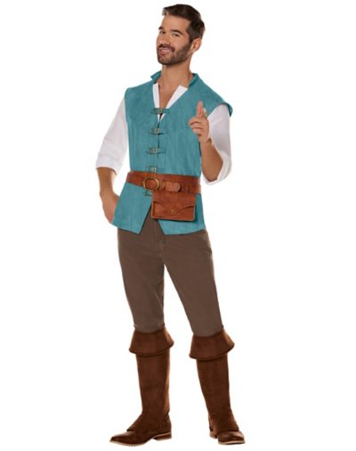 You'll look like you came straight out of a Disney movie when you dress up in this officially licensed Flynn Rider Costume. This Flynn costume will have you looking just like this fan-favorite character from Tangled. Featuring a turquoise two-fer vest with shirt, a belt, and spats, in this officially licensed costume you'll have no problem teaming up with Rapunzel this Halloween. Officially licensed Includes: Two-fer vest and shirt Belt Spats Long sleeves Material: Polyester, polyurethane Buckle closure Care: Spot clean Imported Note: Shoes sold separately.
