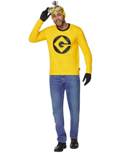 Dress like Kevin the playful Minion with this officially licensed costume kit! This costume kit includes a long sleeve yellow t shirt printed with the symbol of Gru, a yellow knit beanie hat, and a pair of round goggles. Officially licensed Includes: Long sleeve t shirt Goggles Hat Crewneck Long sleeves Pullover style Material: Cotton, polyester, acrylic Care: Hand wash Imported Note: Pants, shoes, and gloves sold separately.