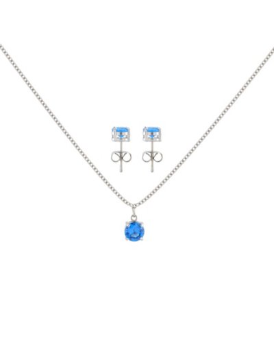Includes: 1 Pair of earrings 1 Necklace Piercing type: Ear Material: 316L Surgical steel Gauge: 20 Gauge / 0.8mm Necklace length: 18" Stone type: Cubic zirconia Stone color: Blue zircon Hypo-allergenic Clasp and stud closure Jewelry care: Clean with antibacterial soap and warm water Piercing care: Clean withH2Ocean Aftercare Spray(sold separately) or saline solution Imported Note: Do not use any harsh, alcohol-based chemicals as this may cause tarnishing Wear in healed piercings only. If irritation occurs, remove immediately This is a decorative item and should not be worn to sleep.