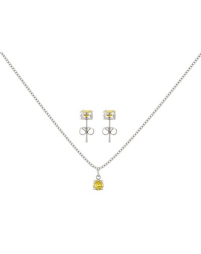 Includes: 1 Pair of earrings 1 Necklace Piercing type: Ear Material: 316L Surgical steel Gauge: 20 Gauge / 0.8mm Necklace length: 18" Stone type: Cubic zirconia Stone color: Citrine Hypo-allergenic Clasp and stud closure Jewelry care: Clean with antibacterial soap and warm water Piercing care: Clean withH2Ocean Aftercare Spray(sold separately) or saline solution Imported Note: Do not use any harsh, alcohol-based chemicals as this may cause tarnishing Wear in healed piercings only. If irritation occurs, remove immediately This is a decorative item and should not be worn to sleep.