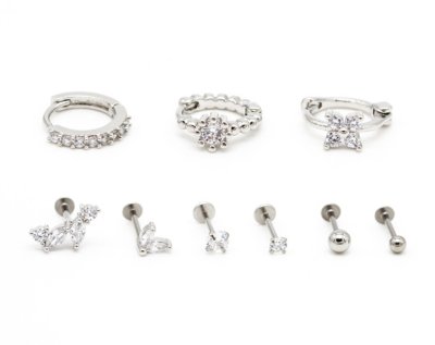 Exclusively at Spencer's Includes: 3 Hoop cartilageearrings 6 Stud cartilageearrings Material: 316L Surgical steel Length: 6mm Ball size: 3mm Stone type: Cubic zirconia Externally threaded closure Jewelry Care: Wipe clean or useSpencer's Jewelry Wipes Imported Note: Do not use any harsh, alcohol-based chemicals as this may cause tarnishing Surgical steel may contain traces of nickel Wear in healed piercings only. If irritation occurs, remove immediately This is a decorative item and should not be worn to sleep.