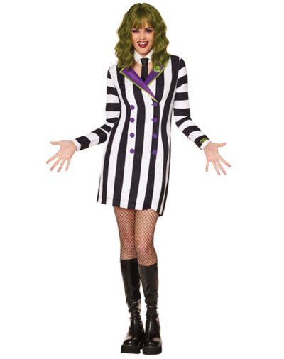 Transform into Beetlejuice in this Adult Blazer Dress Costume! This blazer dress features Beetlejuice's signature black and white stripes along with purple lapels with bright green trim. A Beetlejuice pin and a detached collar with a black tie complete this thrilling costume. Officially licensed Includes: Dress Collar with tie Pin Long sleeves Button closure Material: Polyester, spandex Care: Spot clean Imported Note: Tights and shoes sold separately.