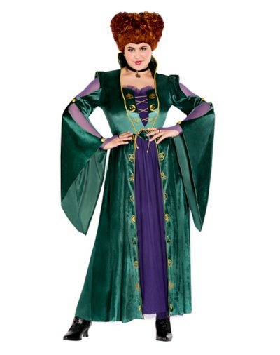 No one is safe this Halloween--not when the Sanderson Sisters are back and better than ever! Take on the role of Winifred Sanderson and cause trouble in the town of Salem when you wear this stylish plus size Winifred costume! Her signature, dark green velvet-like dress has never looked more gorgeous, wrapped around layers of purple fabric and accented with gold-colored foil designs. Bring the story of Hocus Pocus to life! Officially licensed Exclusive Includes: Dress Back Velcro closure Material: Polyester Care: Hand wash Imported Note: Wig and cape sold separately.