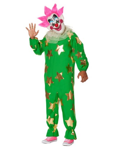 Halloween is the time for clowning around. This officially licensed Adult Plus Size Spikey Jumpsuit Costume is sure to catch eyes and give everyone the heebie-jeebies! We think this costume will be killer! Officially licensed Includes: Jumpsuit Mask Crewneck Long sleeves Material: Polyester Care: Spot clean Imported.