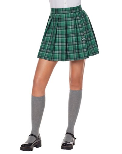 Complete your Harry Potter-inspired Halloween costume when you get this officially licensed Slytherin Skirt! This plaid skirt features the iconic Slytherin logo, serving as the perfect finishing touch to your incredible outfit. Officially licensed Includes: Skirt Material: Polyester, rayon Care: Spot clean Improted Note: Shirt, shoes, and accessories sold separately.