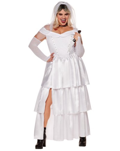 It's time to renew your vows in this officially licensed Tiffany Bride Plus Size Costume. Recreate your favorite scenes from The Bride of Chucky and dress up with your very own ball and chain. Officially licensed Includes: Dress Viel Choker Temporary tattoo Long sleeves Pullover style Material: Polyester Care: Spot clean Imported Note: Accessories and shoes sold separately.