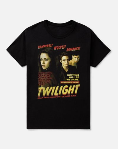 Vampires, Werewolves, Romance, oh my! Show off you're a hardcore fan of the Twilight series by adding this officially licensed tee to your collection. Featuring the trio of Jacob, Edward, and Bella on the front this tee is a must-have for fans of the series. Crewneck Short sleeves Material: Cotton Care: Machine wash; tumble dry low Imported This shirt is Unisex Sizing only For a fitted look, order one size smaller than your normal size Note: This item is print to order and may have a 1-2 day extra processing time.