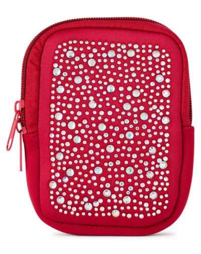 Give your tumbler an upgrade with this red rhinestone tumbler fanny pack! Attach this convenient little pouch to your water bottle for a place to keep your keys, cards, and other small valuables safe and secure. Exclusively at Spencer's Dimensions: 5.8" H x 4.4 W x 1" D Adjustable strap Zipper closure Material: Polyester Care: Spot clean Imported.