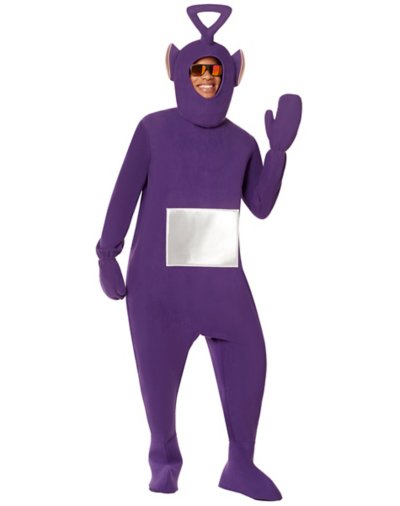 Turn yourself into your favorite on-screen character with this officially licensed Tinky Winky costume. This one piece costume is comfortable and will have all of your onlookers laughing out loud! Officially licensed Includes: Jumpsuit Hood Gloves Long sleeves Side pockets Zipper closure Material: Polyester Care: Spot clean Imported.
