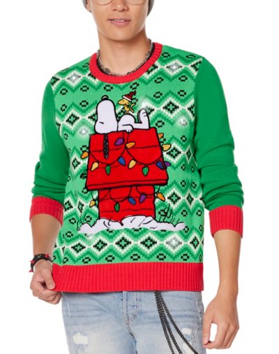 It's not the holidays without Snoopy! Wear this cheerful red and green holiday sweater and let your festive spirit shine. With glowing lights, bright red trim, and a snuggly Snoopy lying flat on top of his dog house, this sweater will make you feel warm and fuzzy. Officially licensed Exclusively at Spencer's Light-up design cycles through solid, blinking, and strobing lights Crewneck Long sleeves Pullover style Batteries Required: 2 AA Batteries (not included) Material: Cotton, acrylic Care: Spot clean Imported This shirt is Unisex Sizing only For a fitted look, order one size smaller than your normal size.