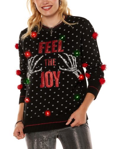 There's no doubt you'll be feeling the joy this holiday while wearing this Feel the Joy Christmas Sweater. This hilarious sweater features lights that cycle through three different light-up modes and a pair of skeleton hands on the chest area. Rock this sweater at the next Christmas party and you'll always be showing your Christmas spirit. Light-up design cycles through solid, blinking, and strobing lights Crewneck Long sleeves Pullover style Batteries Required: AA Batteries (Not included) Material: Cotton, acrylic Care: Spot clean Imported This shirt is Unisex Sizing only For a fitted look, order one size smaller than your normal size.