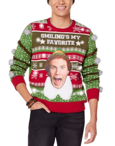 PDon't be a cotton-headed ninny muggins... Get yourself this Elf-inspired Christmas sweater and show off your Christmas cheer! It features an image of Buddy the Elf and the hilarious quote, "Smiling's my favorite." Put on this festive top and represent your favorite Christmas movie. Officially licensed Exclusively at Spencer's Light-up design cycles through solid, blinking, and strobing lights Crewneck Long sleeves Pullover style Batteries Required: 2 AA Batteries (included) Length: About 26.5" from shoulder to hem Material: Cotton, acrylic Care: Spot clean Imported This shirt is Unisex Sizing only For a fitted look, order one size smaller than your normal size.