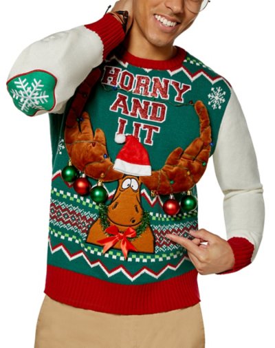 If there's two words to describe how you're feeling this holiday it's horny and lit! With this ugly Christmas sweater on everyone will know you're just that! This horny and lit moose sweater features a light-up moose on the front and from behind you can see his hanging moose junk! This sweater is the perfect way to get your point across while still looking extremely festive! It's the perfect outrageous look for the holidays. Exclusively at Spencers Light-up antlers Crewneck Pullover Long sleeves Length: About 26.5 shoulder to hem Battery Type: 2 AA Batteries (not included) Material: Cotton Care: Spot clean Imported Note: This sweater is Unisex Sizing only For a fitted look, order one size smaller than your normal size.