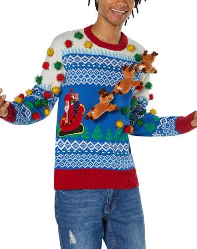 Get ready for your Christmas celebrations! This ugly Christmas sweater is the perfect way to make an impression at your next gathering. With 3D reindeer, sparkly pom-poms, and a light-up pattern, you'll stand out in every crowd. Think that's all we've got? Think again! This ugly Christmas sweater lights up AND it's motion-activated! This super fun, outrageous 3D look is the perfect way to ring in the holidays. Exclusively at Spencer's Light-up pattern design Crewneck Long sleeves Length: About 29" from shoulder to hem Battery Type: 2 AA Batteries Material: Cotton, acrylic Care: Spot clean Imported Note: This sweater is Unisex Sizing only For a fitted look, order one size smaller than your normal size.