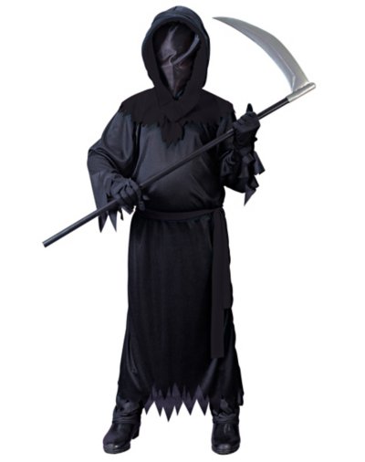 Be as terrifying as night itself with this unknown phantom costume! The mysterious hooded mask and tattered robe will scare and surprise anyone in your path. Nobody will escape your dark grasp! Includes: Robe with hooded face mask Belt Material: Knit polyester Care: Hand wash Imported Note: Scythe sold separately.
