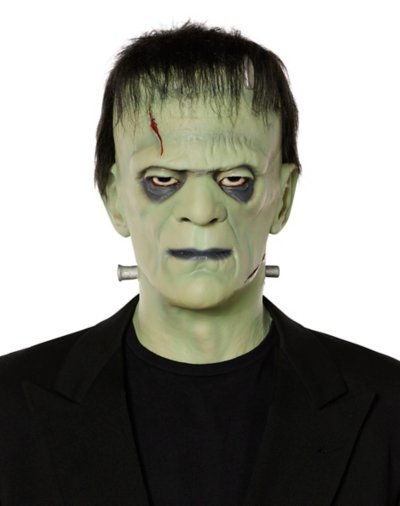 This mask will make a monster out of you. This officially licensed Frankenstein mask features realistic facial features, pale green skin, sunken eyes, bloody scars, and neck bolts. Black hair adorns the top and back of this full mask. Be prepared to scare everyone who crosses your path! Officially licensed Dimensions: About 12 from chin to top of head About 10 from forehead to back of head About 11 from temple to temple About 7 from temple to back of head Material: Latex Hand wash Imported WARNING: Do not use if allergic to latex One size fits most.