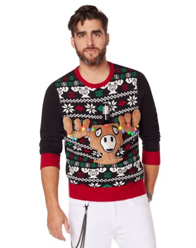 This officially licensed National Lampoon's Christmas Vacation moose sweater has everything you need to make the holidays perfect. Featuring a light-up moose that doubles as a drink holder, this festive sweater is so ugly it's kind of impressive. Officially licensed Exclusively at Spencer's Light-up design cycles through solid, blinking, and strobing lights Crewneck Long sleeves Pullover style Batteries Required: 2 CR2032 (included) Material: Cotton, acrylic Care: Spot clean Imported This shirt is Unisex Sizing only For a fitted look, order one size smaller than your normal size.