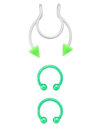 Introducing the Spencers x Kayla Malecc exclusive body jewelry collection! Mix and match these titanium pieces with neon accents for the ultimate glow-up. Exclusively at Spencer's Includes: 1 Fake septum ring 2 Horseshoe rings Piercing Type: Nose Material: G23 Titanium One size fits most Jewelry Care: Clean with antibacterial soap and warm water Piercing Care: Clean withH2Ocean Aftercare Spray(sold separately) or saline solution Imported Note: Do not use any harsh, alcohol-based chemicals as this may cause tarnishing Do not over-thread or apply excess pressure when ad.
