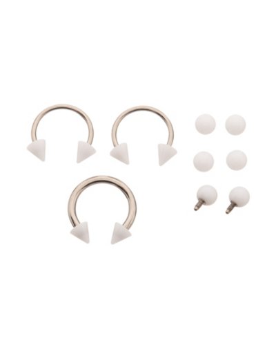 Exclusively at Spencer's Includes: 3 Horseshoes 6 Extra balls Piercing Type: Multiple Barbell Material: G23 Titanium Accent Material: Acrylic Gauge: 16 Gauge/1.2mm Barbell Length: 8mm Ball Size: 3mm Internally and externally threaded closure Jewelry Care: Clean with antibacterial soap and warm water Piercing Care: Clean withH2Ocean Aftercare Spray(sold separately) or saline solution Imported Note: Do not use any harsh, alcohol-based chemicals as this may cause tarnishing Do not over-thread or apply excess pressure when adding/removing beads as breakage could occur.