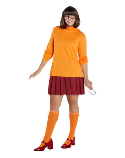 "My glasses. I can't see without my glasses!" Join the gang and get ready to solve a mystery this Halloween when you wear this officially licensed Velma costume. Inspired by the legendary character from Scooby-Doo, this outfit features a shirt, skirt, thigh highs, and of course her iconic glasses. Rep your favorite TV series in style! Officially licensed Includes: Shirt Skirt Thigh highs Glasses Turtleneck Sleeveless Pullover style Material: Polyester, rayon, cotton, spandex Care: Spot clean Imported Note: Shoes and prop sold separately.
