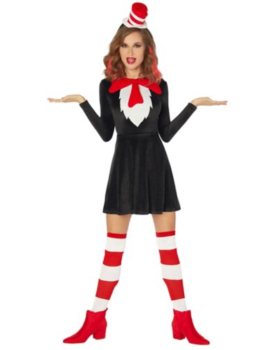 Look like you've stepped right out of your favorite children's book in this official Dr. Seuss Cat in the Hat Dress! This look also comes with a matching headband featuring a mini red and white top hat and red and white striped socks to complete your Cat in the Hat costume. This charmingand white skater dress also features the Cat in the Hat's red tie. It's the perfect costume to wear on your own or as part of a group look. Officially licensed Includes: Dress Headband Socks Material: Polyester, spandex Care: Spot clean Imported Note: Shoes sold separately.