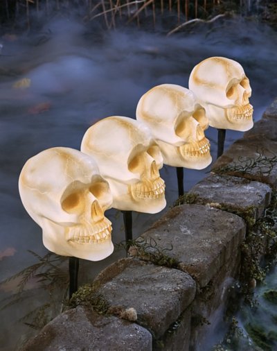 Line your walkway, porch or driveway with these glowing Skull head lawn stakes - they feature LED lights which illuminate the spooky skulls in eerie and frightful fashion. Sold as a set of four but you might want even more! Includes: 4 light stakes Timer feature (On for 6 hours, off for 18 hours) Outdoor or outdoor use Battery Type: 3 AA (included) Dimensions: 7.87" H x 18.89" W x 7.28" D Weight: 1.18 pounds Material: Plastic Care: Spot clean Imported.