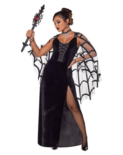 Spin your web of lies this Halloween when you dress up in this stylish black widow dress costume. With this stylish black dress on with attached spider web cape you'll have one of the best looking outfits at the costume party. Wear the included spider web necklace and you'll be ready to seduce anyone into your web. Includes: Dress with an attached cape Necklace Sleeveless Material: Polyester, spandex Pullover closure Care: Spot clean Imported Note: Staff, stockings, and shoes sold separately.