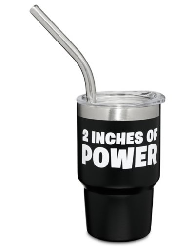 Want to show off your favorite cup but a smaller version? This adorable 2 Inches of Power Travel Cup with Straw is perfect to match a little one, to pull out at parties or to keep your favorite drinks cold on the go. Exclusively at Spencer's Dimensions: 5.2" H x 1.8" W x 2" D Capacity: oz. Material: Stainless steel Care: Gently hand wash only Imported.