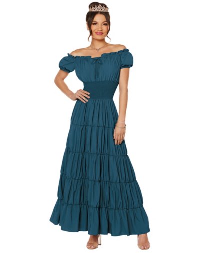 Searching for something that'll turn heads at your next Halloween celebration? Look no further than this beautiful Teal Peasant Dress, which features a ruffled design and an off-the-shoulder neckline. No matter what you decide to be this Halloween, this dress is sure to impress. Off-the-shoulder neckline Short sleeves Pullover style Material: Polyester, spandex Care: Hand wash Imported Note: Shoes, jewelry, and props sold separately.