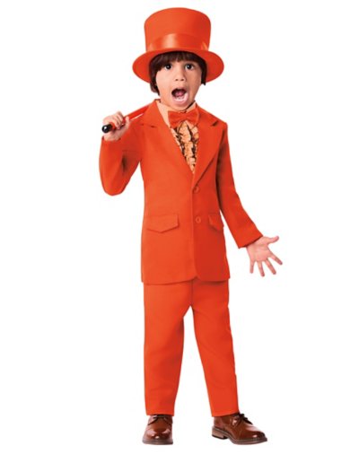 Help your little one channel their inner goofball with this officially licensed Lloyd Costume from Dumb and Dumber! This costume features an orange suit jacket with attached shirt, bow tie, and cummerbund, suit pants, top hat, and a cane accessory! Officially licensed Includes: Twofer jacket with attached shirt, bowtie, and cummerbund Pants Cane Hat Long sleeves Material: Polyester, spandex Care: Spot clean Imported Note: Shoes sold separately.