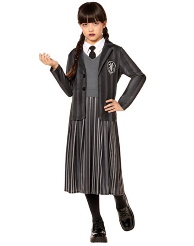 Wish you could become Wednesday Addams? Youll look like you came straight from Nevermore Academy when you dress up in this officially licensed Wednesday costume. Featuring a school uniform dress and a pinstriped jacket, this outfit is perfect for any fan of the popular series! Officially licensed Includes: Jacket Dress Crewneck Long sleeves Pullover style Material: Polyester Care: Spot clean Imported Note: Shoes sold separately.