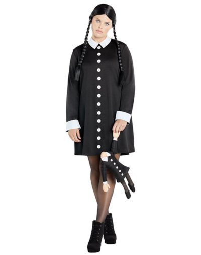 Wednesday's child is full of woe! Transform into the sweet and spooky Wednesday Addams when you slip into this officially licensed Wednesday Addams Plus Size Costume from The Addams Family!Featuring adress with a white collar, white cuffs, and button details, you'll feel like Wednesday Addams as soon as you put it on. Top off the look withtights! Officially licensed Includes: Dress Tights Doll Long sleeves Zipper closure Material: Polyester Care: Hand wash Imported Note: Shoes and wig sold separately.