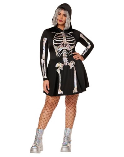 You'll be the cutest skeleton in town in this hooded skater dress. This plus size skeleton dress features long sleeves, a flirty skater skirt, and holographic bones! Includes: Hooded dress Long sleeves Material: Polyester, spandex Care: Spot clean Imported Note: Tights and shoes sold separately.