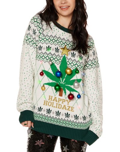 Celebrate the holiday season by taking your style to a higher level and rocking this happy holidaze ugly Christmas sweater. This weed friendly sweater features a decorated pot leaf on the front of it with colored ornaments and a star to truly give it an authentic Christmas look. Youll have the most wonderful high of the year with this ugly Christmas sweater! If you're ready to get outrageous, this sweater's for you. Exclusively at Spencers Crewneck Pullover Long sleeves Tagless About 26.5" (from shoulder to hem) Material: Cotton, acrylic Care: Spot clean Imported This sweater is Unisex Sizing only For a fitted look, order one size smaller than your normal size Note: Necklace, bracelets, pants, and shoes sold separately.