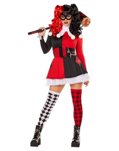 Become the Maid of Mischief herself this Halloween in this officially licensed Classic Harley Quinn Costume. This costume from our Signature Collection is the ultimate get-up to transform into your favorite DC Villain including Harley's classic red and black dress, white collar with attached pom poms, pleated cuffs, a black and red waist cinch with branded metal charms, a two-tone pigtails wig, a black eye mask, and diamond pattern socks to complete the iconic look. You'll love causing mayhem all over Gotham this Halloween in this Signature Harley Quinn costume. Officially licensed Includes: Dress with petticoat Stuffed collar with attached pom poms Pleated cuffs Waist cinch Wig Mask Socks Long sleeves Material: Polyester, p.