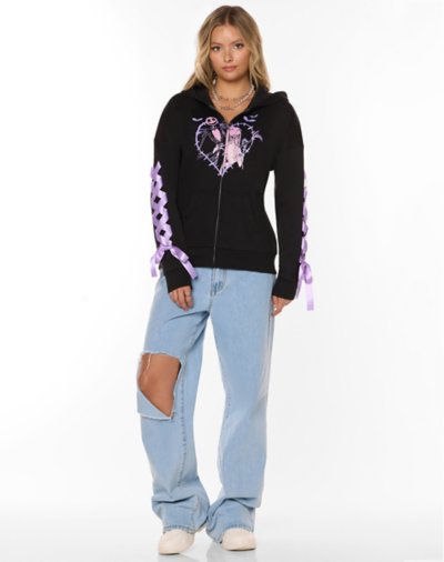 Embrace your favorite characters in style with this Pastel Jack and Sally Zip Hoodie. Featuring purple ribbon lacing up the arms, its the perfect blend of cute and creepy! Officially licensed Crewneck Long sleeves Material: Cotton Care: Machine wash; tumble dry low Imported This hoodie is Unisex Sizing only For a fitted look, order one size smaller than your normal size.