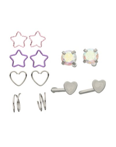 Includes: 2 Pin nose rings 2 L-bends 8 Nose hoops Piercing Type: Nose Material: 316L Surgical steel Gauge: Gauge/0.8mm Stone Type: Cubic zirconia Jewelry Care: Clean with antibacterial soap and warm water Piercing Care: Clean withH2Ocean Aftercare Spray(sold separately) or saline solution Imported Note: Do not use any harsh, alcohol-based chemicals as this may cause tarnishing.