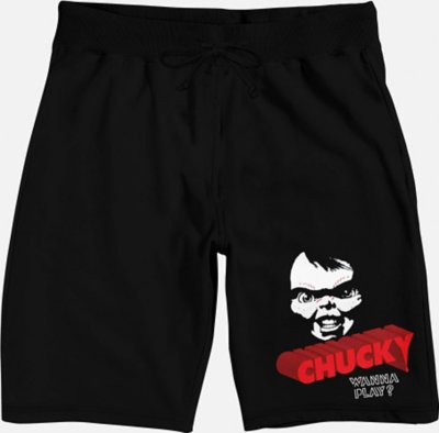 Hey, wanna play? Add some horror to your wardrobe with these officially licensedBlack Chucky Wanna Play Shorts. Officially licensed Material: Polyester and spandex Care: Machine wash Imported.