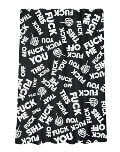 Fuck this, fuck that, fuck off, and fuck everything in between. Show your guests how you're feeling with this hilariousSkeleton Middle Finger Shower Curtain, perfect for Halloween or year-round use! Exclusively at Spencer's Dimensions: 71" H x 72" W Material: Polyester Care: Spot clean Imported.